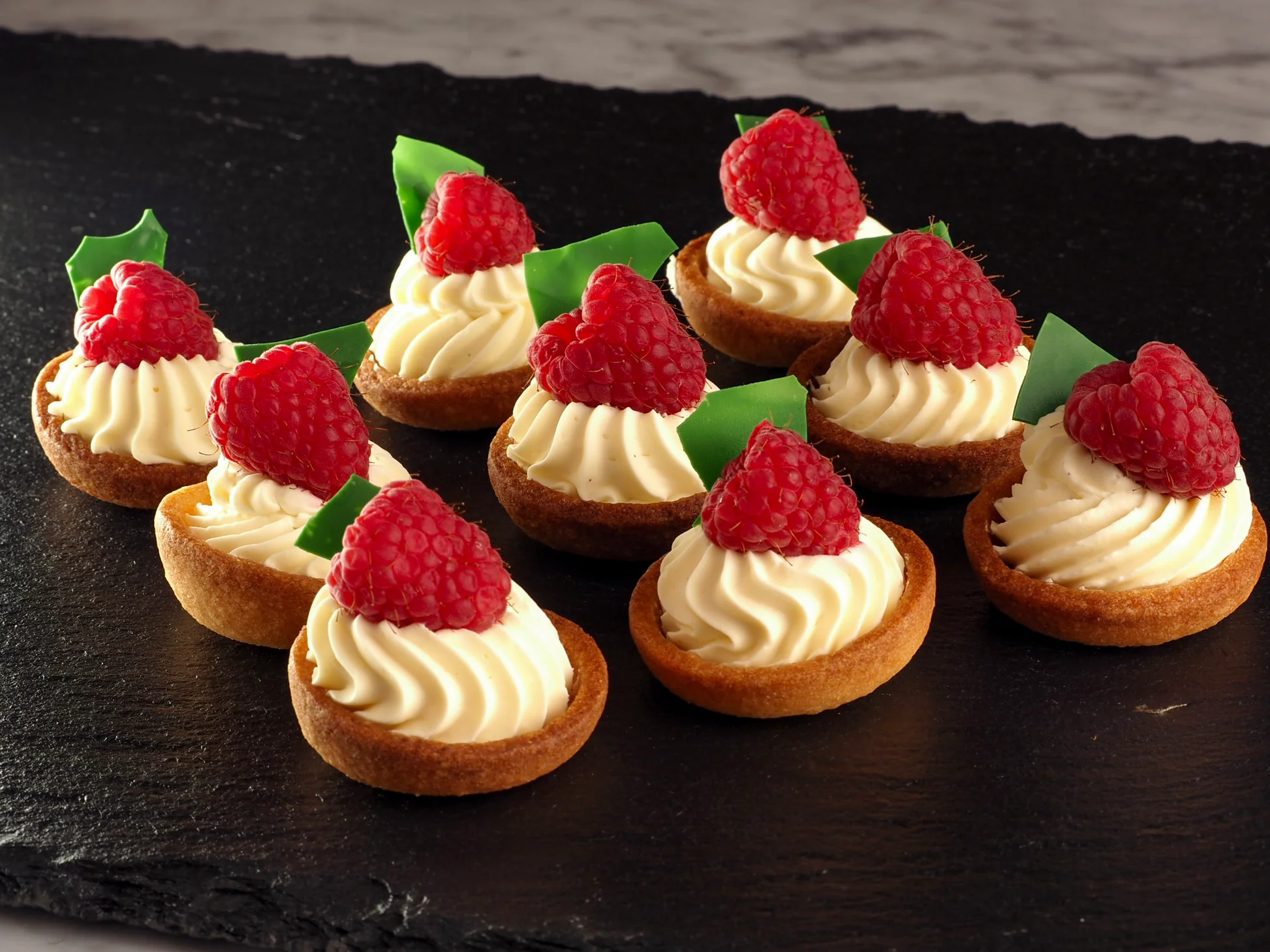 Bringebær tertene våre består av vår miniatyrterte fylt med namelaka krem og toppet med et ferskt bringebær.