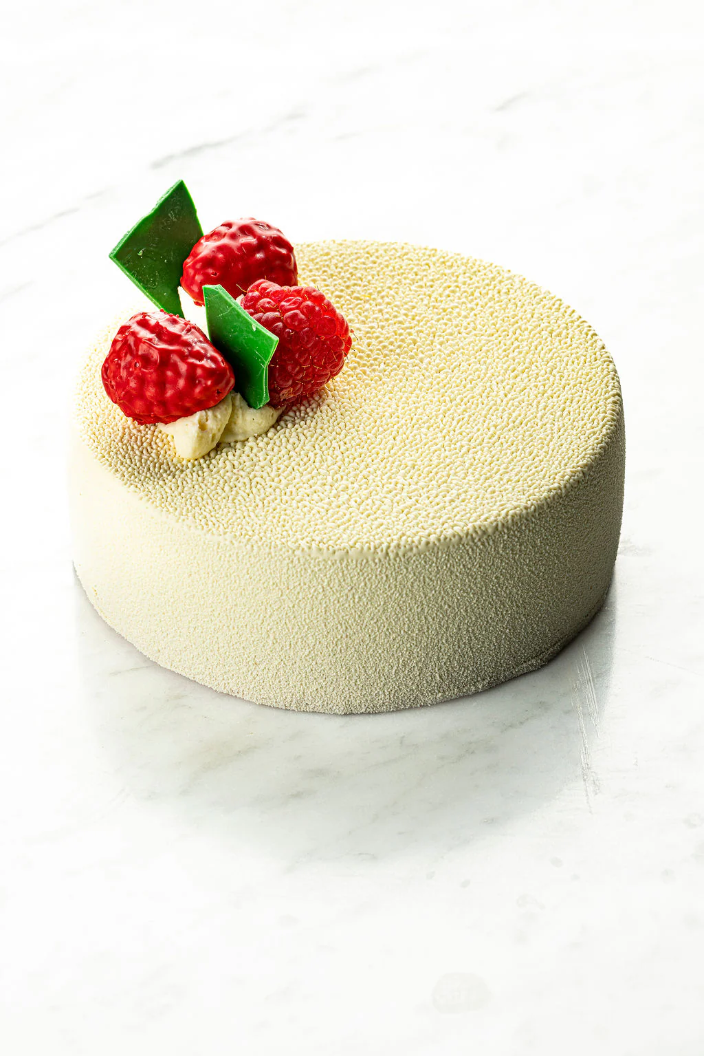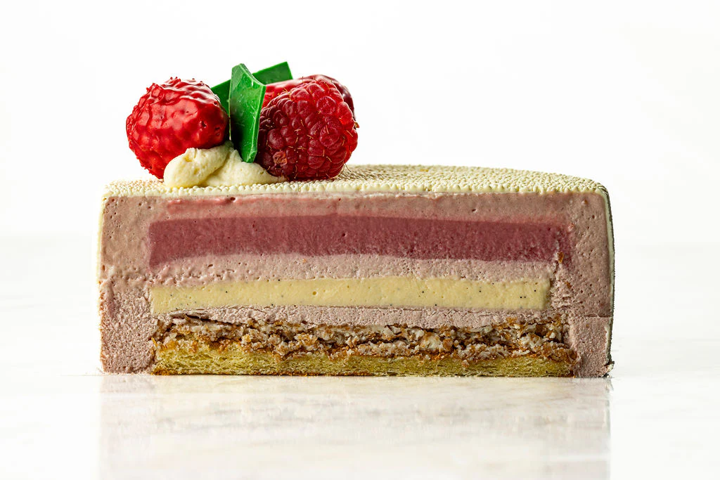 Sukkerbrød, créme brulee, bringebær cremeux, bringebær mousse med hvit sjokolade, dekket av et skjell med hvit sjokolade. / Sugar bread, crème brulee, raspberry cremeux, raspberry mousse with white chocolate, covered in a white chocolate shell.
