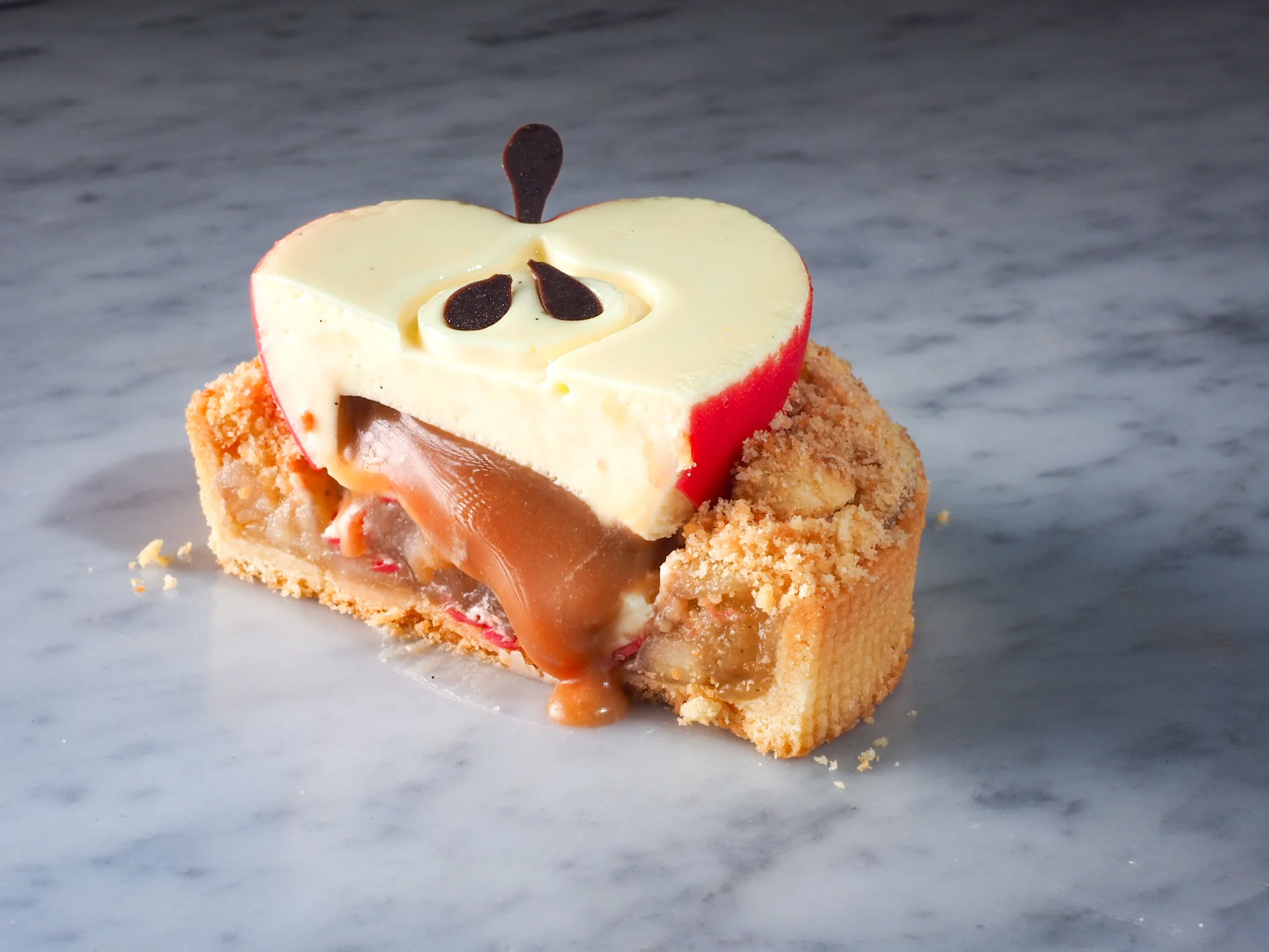 Apple er en elegant dessert inspirert av den klassiske eplekaken, men i en moderne, konditorisk versjon. Under den sprø bunnen skjuler det seg en delikat eple- og sitronmousse, karamell og en lett vaniljemousse. Kombinasjonen av den sprø bunnen, det saftige eplet, den friske sitronen og den fløyelsmyke vaniljesøtheten skaper en flerlags, harmonisk smak som passer perfekt til en kopp kaffe eller te.
