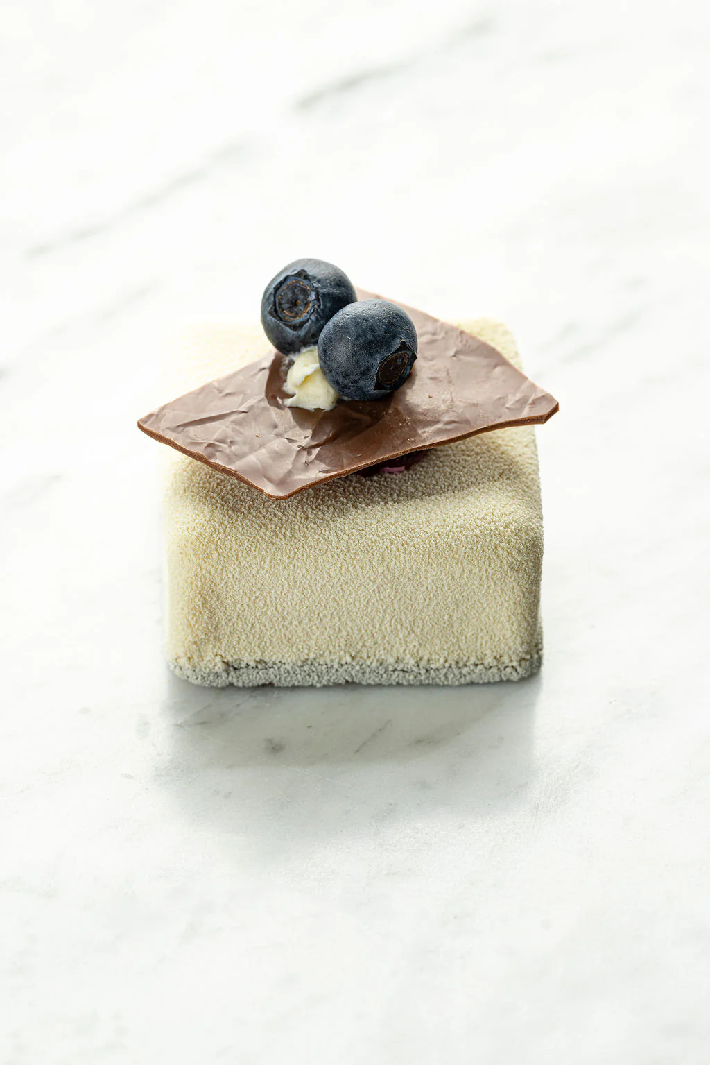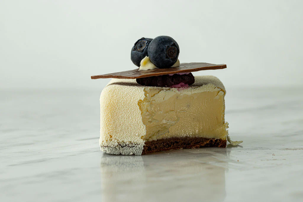New York Ostekake er en individuell, elegant versjon av den klassiske New York-ostekaken. På en delikat, søt bunn av sukkerkake ligger en tykk, kremaktig masse av Philadelphia-ost, hvis fløyelsaktige struktur og subtile vaniljenote er karakteristisk for denne ikoniske desserten. Det hele kompletteres med et lag fruktig cremeux av en blanding av bær og en lett gelé av forskjellige frukter, som gir friskhet og bryter med ostekakens søthet.