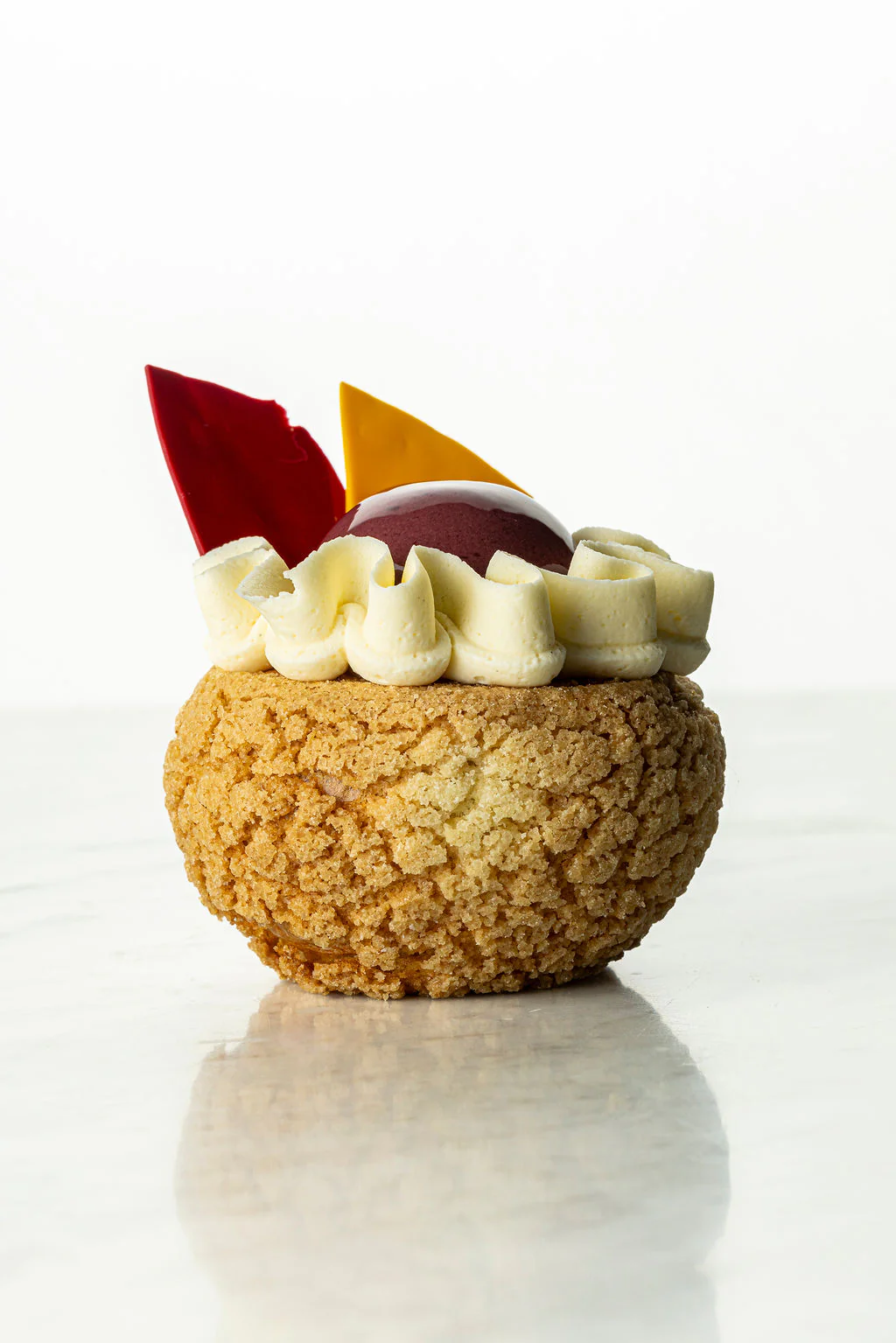 Profiterole er en dessert inspirert av klassiske franske bakverk, men servert i en moderne form. Den sprø, smørrike basen av choux-deig er fylt med et lag fruktkonfekt og en lett, silkemyk sjokolademousse. Kontrasten mellom den sprø strukturen i bunnen og den kremete, intense sjokolademassen og fruktens søthet gjør at hver bit er uttrykksfull, men samtidig harmonisk og overraskende lett.